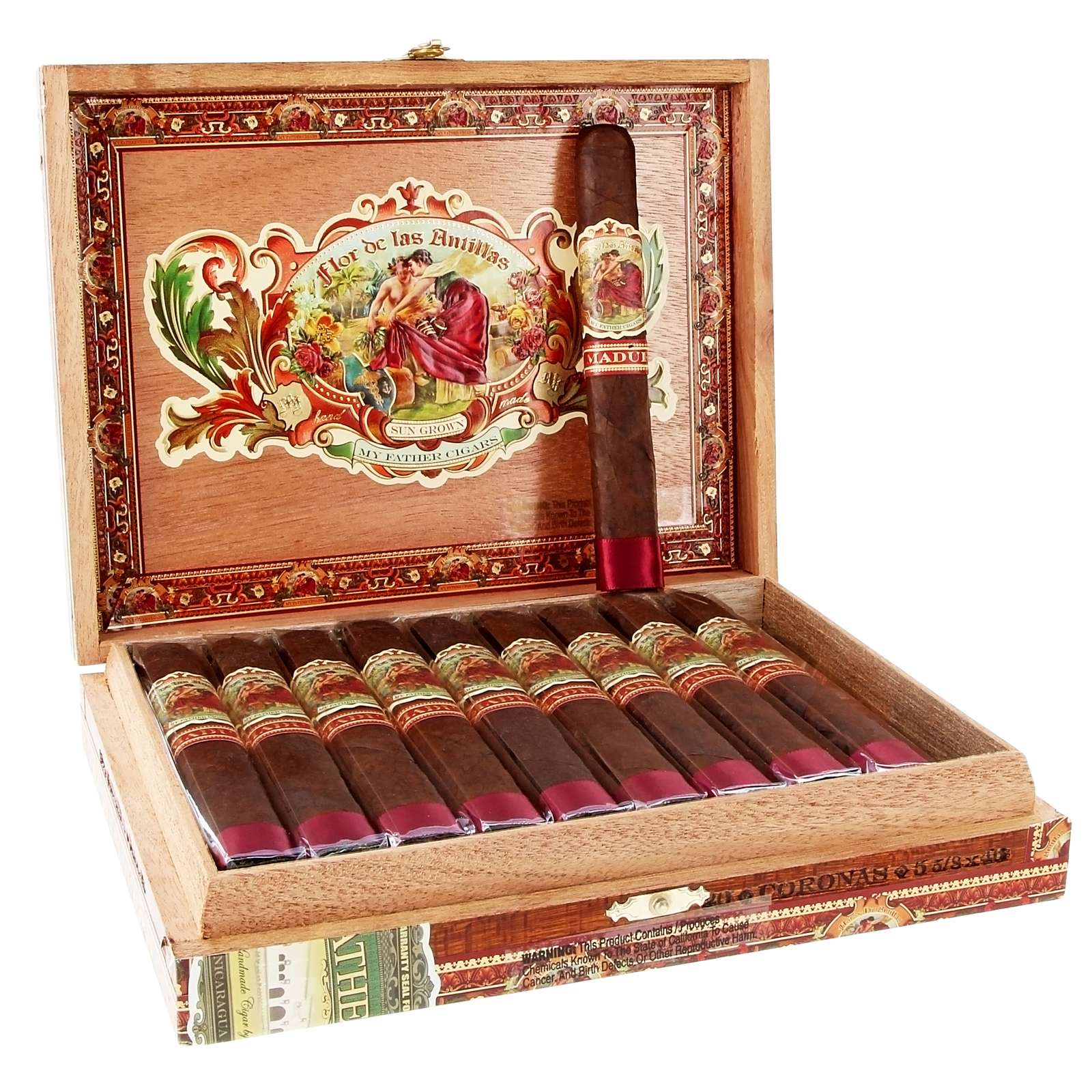 The Flor de las Antillas Maduro Corona is a full-strength, box-pressed stick that is skillfully handmade in Esteli, Nicaragua, a region well-known for producing some of the finest tobacco in the world. A dark, Ecuadorian Habano wrapper surrounds the Flor de las Antillas Maduro?s Nicaraguan binder and filler to create a very outdoorsy aroma that hints of leather, hay, and leather.